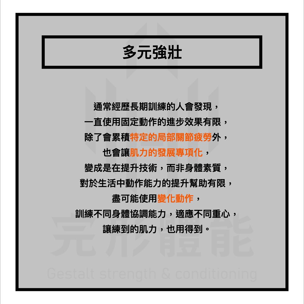 比起坊間的體適能指導原則,我們的訓練法不同之處在於,訓練入侵的強度區間相對較高,完備的動作控制與動作學習流程,會嘗試開發學生多元的身體能力。