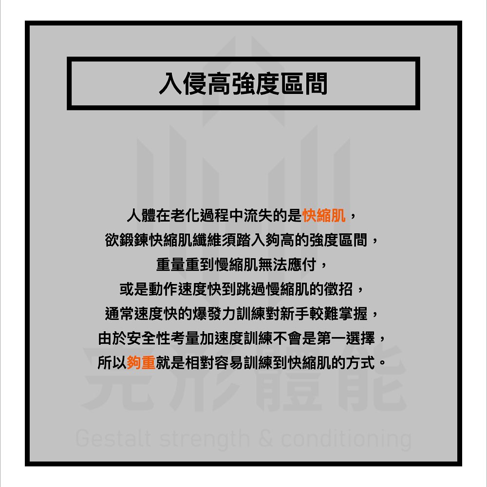 然而,老化過程中人體流失的是白肌,根據肌肉徵招順序的大小原則(Size Principle),低度用力的身體活動小運動單位會先被招募,除非太重、動作速度太快,小運動單元負荷不了,才會徵招大運動單元,或跳過小運動單元的徵招。那麽,到底多重或多快才會徵招大運動單元出來用力呢?快速度與爆發力動作在沒有基本的訓練經驗,不建議一開始就使用,想要達到關鍵強度,重量的百分比建議在75%以上,超過10RM的重量。比起動則15-20下的運動指導建議,強度約略在60%以下,對於鍛鍊到快縮肌的重量需求是不足的,對於練到流失的快縮肌,不會是最直接的方式。